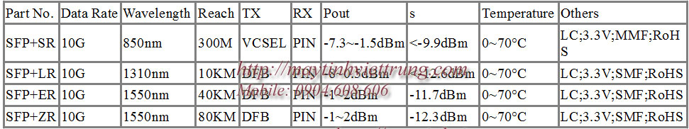 Thông số kỹ thuật : Module quang SFP+ 10Gbps